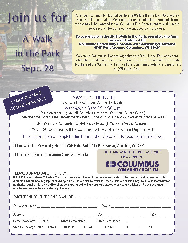 To participate in the 2016 Walk in the Park, contact the Prairie Ridge Health Community Relations Department at 920-623-1280 or stop by the hospital to pick up a registration form. A $20 donation includes participation in the walk, a t-shirt, light up armband, or smart phone carrier and a sub sandwich supper, all provided by Prairie Ridge Health, with 100 percent of the donation going to the cause.