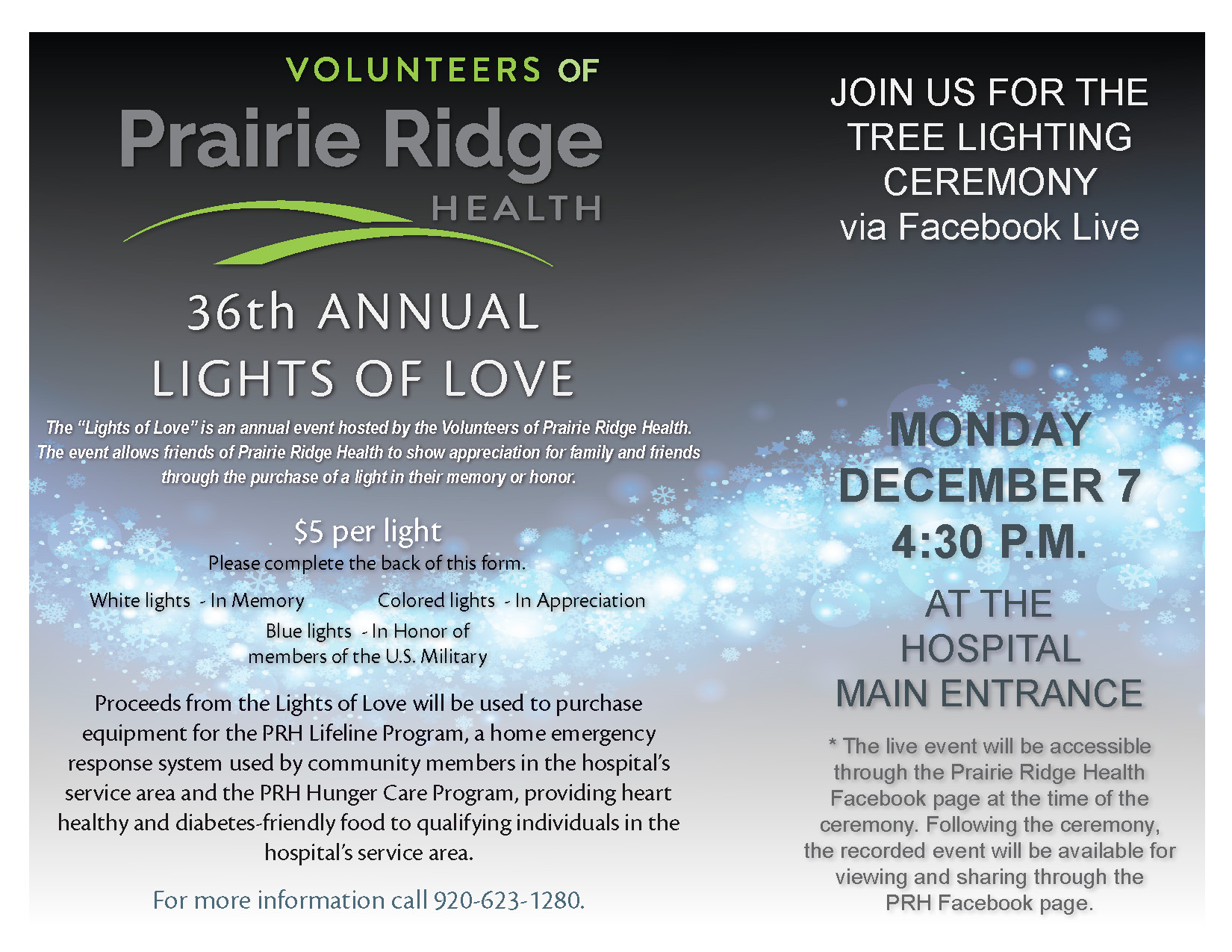 The Volunteers of Prairie Ridge Health held their 36th Annual Lights of Love virtually on Dec. 7 via a Facebook Live event. Three trees, located at the hospital's main entrance,...